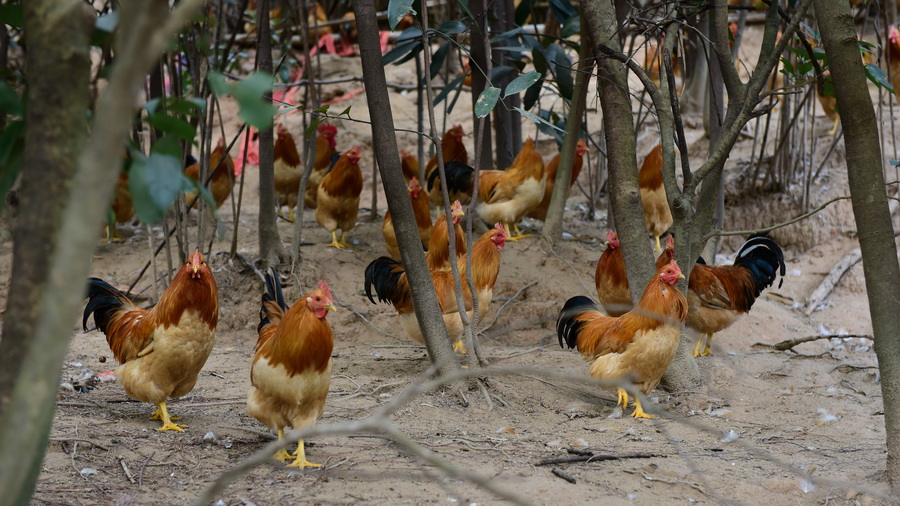 张小盈继续告诉我,近几年,虽然郁南县养鸡户发展很快,但是,螺村走地鸡因养殖要求严格,养殖期达半年,鸡的重量保持在2.5斤以内,所以每批养殖数量一般只有二、三千只左右,她们准备扩大养殖林地,要每批养殖数量达一万只。不过,在其它村镇,也有五、六家养殖户,规模也不小,与螺村走地鸡一起形成产业链,可以供应各大酒店和城里慕名而来的食客的需求。现在产业化规模最大的是广东优越鲜农业科技有限公司,他们集科学养殖、加工、销售于一体,通过二维码溯源和电商销售,直接面对市场,让消费者更容易吃到新鲜的螺村鸡,而且,他们还开启宠物鸡养殖模式,过程可以估值和转让。