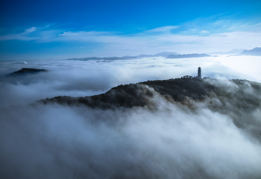 但越来越多的人选择了继续抬腿登顶。喘着气再爬高20来米,你就实现了登顶大王山的愿望。更为重要的是,文德塔在这里等着你。