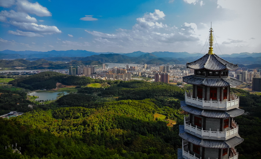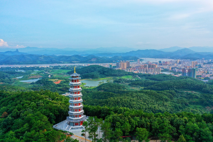 登临塔顶,惊奇地发现,文德塔与西江对岸的著名景观华表石(民间多称呼为金火石)遥相顾盼,恰似巨椽两枝,争相在长天擘画。畅然极目环视,两广三市诸地的十万大山似乎奔来眼底,广昆高速、南广高铁的车轮呼啸来去,怀阳高速则跨江越岭,向着初升的太阳,如同戏珠的长龙向偏东腾越。千里东行、浩浩荡荡的西江进入郁南后,在此竟然折向南行,刚过都城,突然又掉头往西,九曲回转,逶迤向海。号称“小广州”的都城,今天可以安然地在西江南岸的群山怀抱中,延续着千年人间烟火,编织着当代幸福安宁。