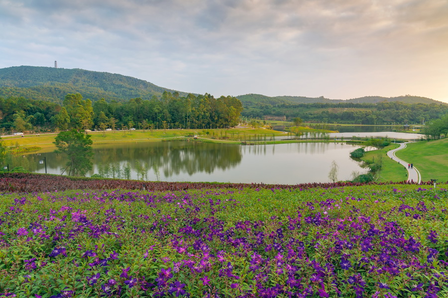 环西宁湖一周两公里多点,湖面、绿地、双环休闲径景观各占三分之一,共同构成20多万平方米湖区景观。景区内有若干亲水平台,客亭、廊架、游步道、骑行道等休闲、康养设施自然安置在翠绿的草坪上。清晨,健身的人们围绕着薄雾缭绕的湖区、清澈见底的湖水,或跑步,或健行。间或也可见到练太极拳的、跳健身舞的。孩子们则最喜欢到草地上打滚撒欢,到亲水平台喂鱼逗趣。情侣们则挑一个好日子,在草坪、客亭、樱花丛中、羽杉林下,留影最美好的时刻。“小阳春”时,粉红满树的美丽异木棉下,更是野营的好所在,或随意,或时尚的野营点星罗棋布,一家大小其乐融融,让西宁湖充满了温馨和幸福。