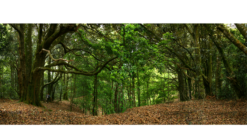 山路弯弯,一路风景美不胜收。香樟、红椿、槠树、马尾松等高大挺拔的乔木如同坐标,无意中为我们指引着方向;野牡丹、桃金娘、牛耳枫等灌木也不甘落后,它们四季常绿,成了同乐大山美景不可或缺的重要组成部分。最常见的是草丛,特别是五节芒萁,一片片、一丛丛,不经意地生长着,不与大树争高,不与灌木争光,低调地躲藏在藤蔓缠绕的逼仄空间,以卑微的绿芒点缀五彩缤纷的森林世界。令人惊喜的是,我们还见到几株千年古树,其中有一株是华南地区罕见的广东紫薇,正值开花时节,那团团簇簇或银白或紫红的花儿,极为粲丽。