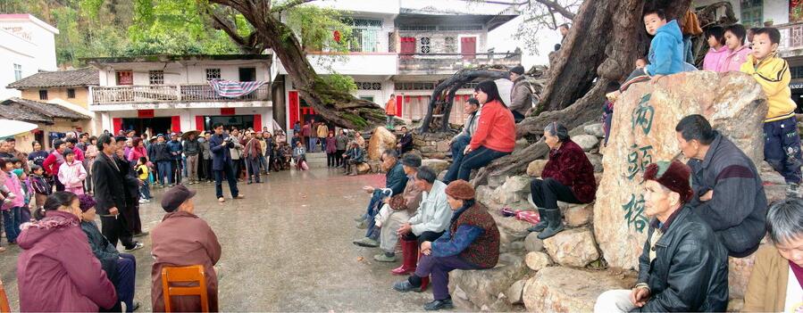 榕树下,断桥边,隔着一条小河,歌伯陶兴财一开腔便以山歌传情,对岸的歌婆莫池英紧咬对方的歌尾,以歌咬尾词传情,这边唱来那边和。