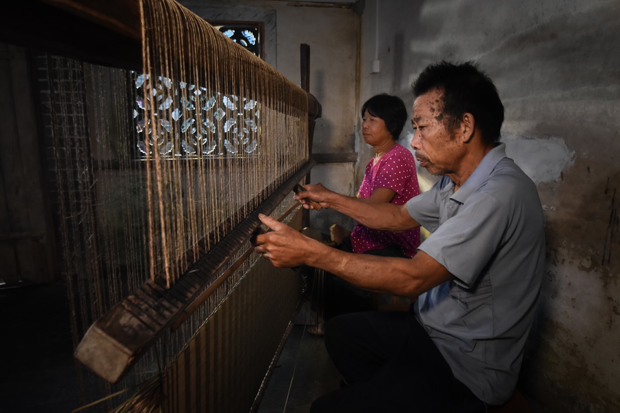 朱国新说,织横经席需要两个人共同配合才能完成。每次织席,他都喜欢叫上胞妹做帮手。朱国新有四兄妹,他排行老三,妹妹比他小五岁。从小,三哥负责打栲(即坐在木机前面中间位置,两手抓住席栲两个把手将席栲提升往下压席草),妹妹负责叉草、送草。工作中,两人谈天说地,有说有笑,一天下来,织3张席都不觉得累。由于配合默契,织的横经席平滑幼细、厚软适度、坚实耐用,深受顾客欢迎。久而久之,两兄妹就成了最佳拍档。妹妹结婚后,当三哥织席需要帮忙时,她会安排好家中大小事务后跑回娘家,几十年如一日,从不间断。在大湾镇,还有不少人会织横经席,要找个帮手也不是难事。曾经有人问道:“一张横经席卖不了多少钱,你这样来回奔波,何苦呢?”妹妹呵呵一笑:“不是钱多少的问题!我们县文化局的崔主任说过,祖辈留下来的实物,叫做遗产;咱兄妹的手艺也是祖辈留下来的,叫做非物质文化遗产,我们要好好守护……”