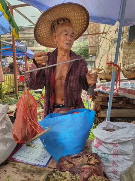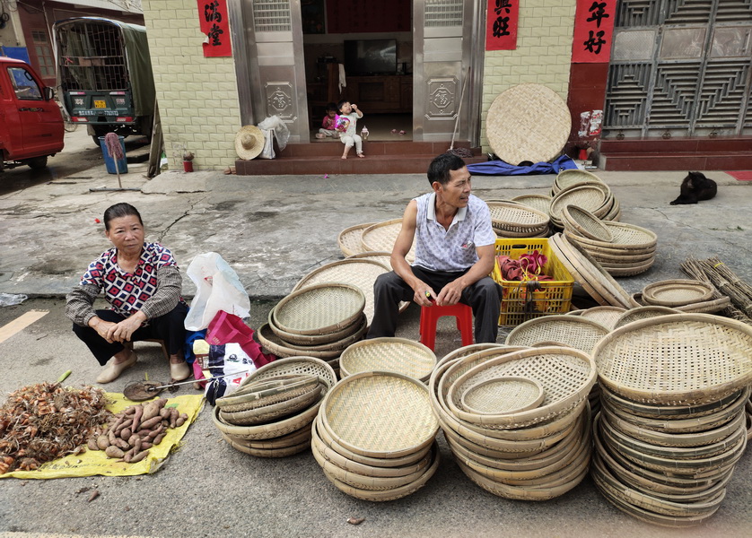 大堤路两旁摆满了土特产,尤以干货为主:玲珑别致的竹编,脆生生的黄瓜片,黄澄澄的竹笋干,漆黑中带点赤红的榄角,浓香扑鼻的肉桂皮,甜蜜蜜的罗旁蜜枣,干爽红艳又色泽不减的红菌干……哈,竟然还有一个卖鸡的小摊占了一个位置,大公鸡站在鸡笼上,不跑也不闹,小眼睛东张西望。卖鸡的老伯大声吆喝:“有靓鸡喔喂,自己养的,便宜卖!便宜卖!”
