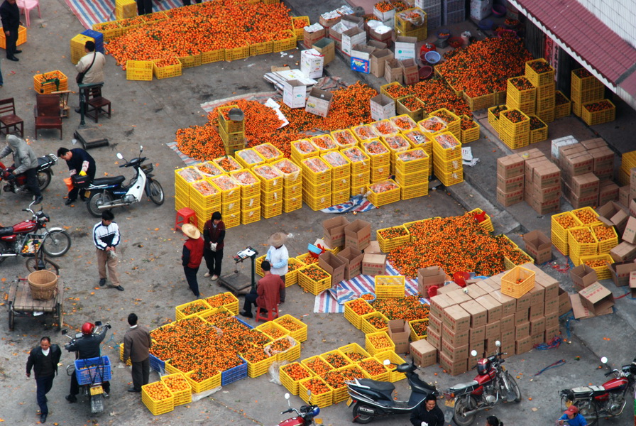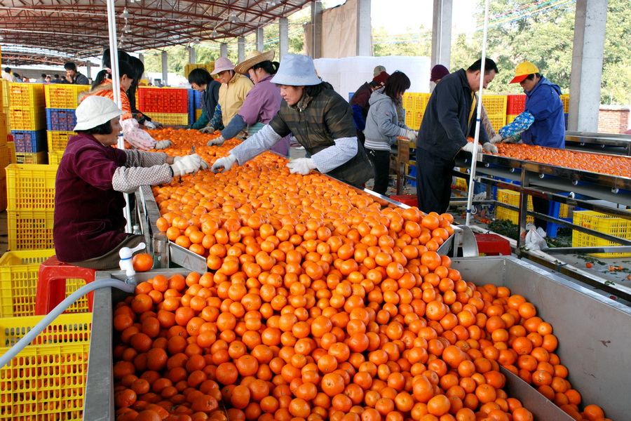 虽然我来得不是时候,却也能吃到新鲜的果子。在老关的冷库里就冷藏着30万斤鲜果,保鲜期长达2个月。仓库的空地上,堆满了橙红色的沃柑,工人们麻利地清洗、分拣、套袋、装箱,他们爽朗的笑声,随着弥漫在空气中的清香飞上了蓝天。