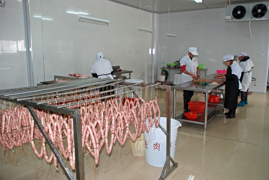 我们在毛记和御福记家的生产作坊参观时发现,整个现场已清洗收拾得干干净净了。一问才知道,他们的生产时间一般是在每年阳历8月初,即秋风起时开始采购猪肉等新鲜原材料进行制作,一直到次年的4月底、5月初为止。所以买腊肠也要看时间,这俨然成为郁南腊味的一大特色了。